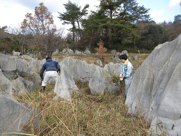 We also participate in the Activity to Protect and Nurture the Grasslands of Akiyoshidai in Mine City, Yamaguchi Prefecture (traditional events of himichi-kiri and yama-yaki [controlled burning of mountains]) every year. This activity is a traditional event with the participation of related organizations and local people, as well as companies and their families in the prefecture.