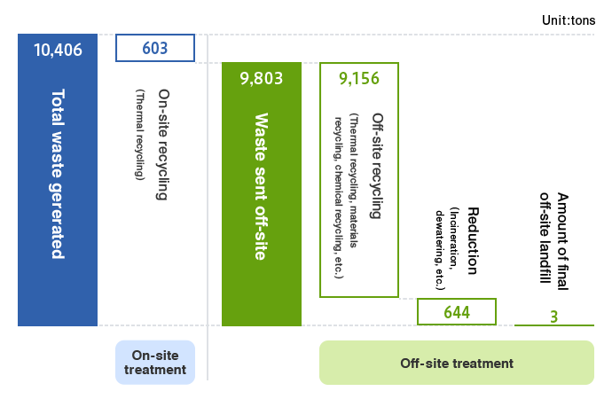 In FY2024, the amount of industrial waste we generated was 10,000 tons (down 11% from the previous year), and the recycling rate was 94%. Although the amount of industrial waste we generate fluctuates along with production volume, we will continue our efforts to curb the amount while promoting recycling and taking a long-term perspective in our activities.