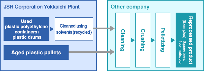 For example, used plastic polyethylene containers and plastic drums at the Yokkaichi Plant are cleaned using recycled solvents and supplied to other companies. They are recycled at these companies and transformed into new products such as square bars and floor mats. We contribute to waste reduction by recycling materials that are no longer needed and by using recycled products in the recycling process.