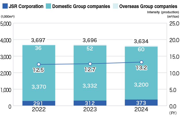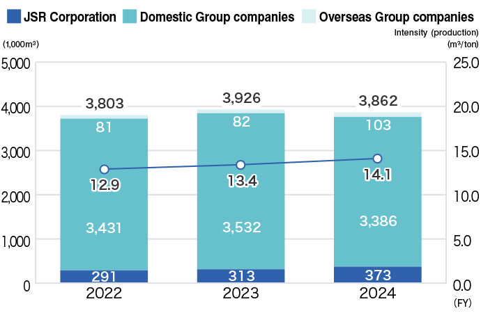 In FY2024, JSR Group consumed 3,862,000 m3 of water (down 2% year on year) and the total discharge was 3,634,000 m3 (down 2% year on year).