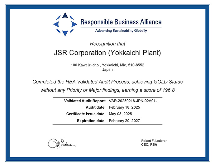 Yokkaichi Plant received a Gold rating in the RBA VAP Recognition Program, based on an assessment conducted by an RBA-approved, independent audit firm in 2025. The Responsible Business Alliance (RBA) is an international organization promoting responsible business conduct in global supply chains.