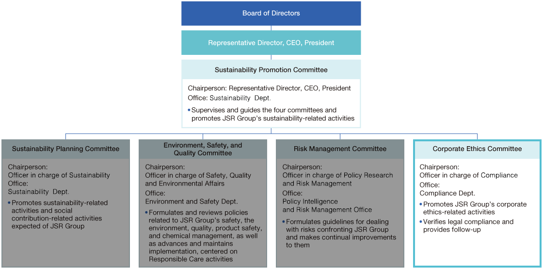 JSR Group’s Corporate Ethics Committee, chaired by the officer in charge of compliance, plays a central role in advancing corporate ethics activities across all Group companies in Japan and overseas. We are working to disseminate the JSR Group Principles of Corporate Ethics, to grasp and improve corporate ethics-related issues through the Corporate Ethics Awareness Survey, and establish and properly operate a Corporate Ethics Hotline. The Committee is also responsible for advancing Group-wide legal compliance initiatives.