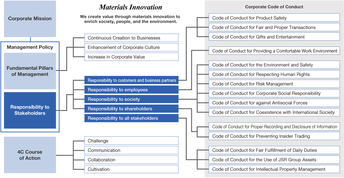 JSR Group has been endeavoring, by building up and maintaining good relationships with all our stakeholders, to become a trustworthy and indispensable corporate citizen. We have been vigorously executing our Code of Conduct in order to fulfill “Our Responsibility to Our Stakeholders,” an essential part of our Management Policies, as well as to ensure compliance with relevant laws and regulations during the course of our business.