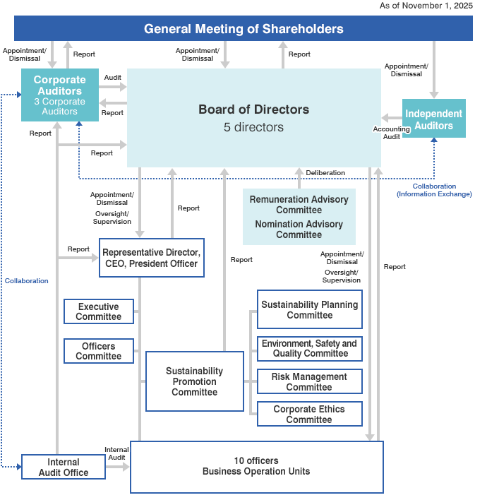 Under the above policy, as a company with Corporate Auditors, JSR principally monitors and oversees the execution of duties by directors and the management through its Board of Directors and Corporate Auditors, and will strengthen its function of management supervision through measures such as establishing the Remuneration Advisory Committee and Nomination Advisory Committee. This will maintain management transparency and soundness while continuously striving to accelerate and enhance the efficiency of decision-making and business execution aimed at improving corporate value over the medium to long term.