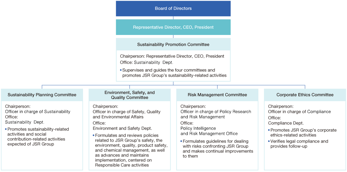 JSR Group established its Sustainability Promotion Committee in 2020. The committee discusses and coordinates on matters related to sustainability, including policies, in line with internal and external circumstances relating to ESG and the SDGs.