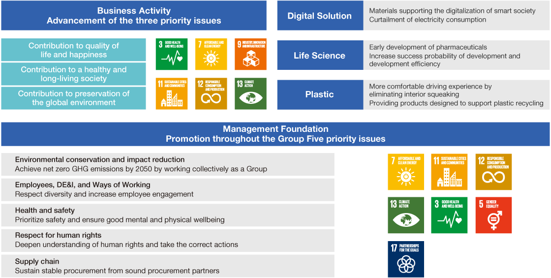 The materiality of Business Activity stipulated that the Group contributes to society by providing products and services that demonstrate various effects in “Contribution to Quality of Life and Happiness,” “Contribution to a Healthy and Long-Living Society,” and “Contribution to Preservation of the Global Environment,” in each of the Digital Solutions Business, Life Sciences Business, and Plastics Business that the Group engages in.