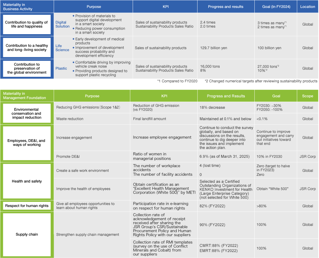 The applicable materiality covers the period from FY2022 to FY2024. In FY2024, the final year of this materiality, we confirmed the achievement status of each KPI and obtained results that will serve as the foundation for the next strategy.