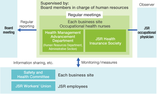 JSR Group, recognizing the physical and mental health of its employees as an important foundation of management, promotes health and productivity management across the organization. JSR Corporation holds the Health Promotion Committee, which is overseen by the officer in charge of human resources. At each business site, industrial physicians, industrial nurses, and health management promotion departments play central roles in monitoring and implementing relevant measures. Management communicates the significance of health advancement through messages from top executives, receives regular reports from the Health Promotion Committee, and supervises relevant activities.