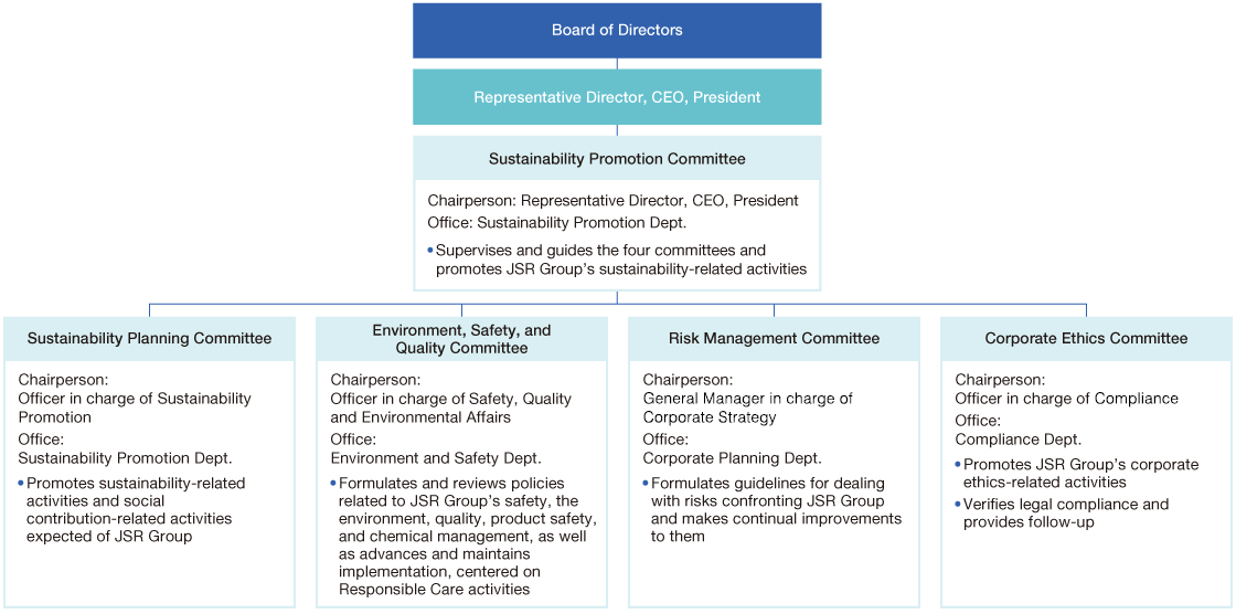 JSR Group established its Sustainability Promotion Committee in 2020. The committee discusses and coordinates on matters related to sustainability, including policies, in line with internal and external circumstances relating to ESG and the SDGs.