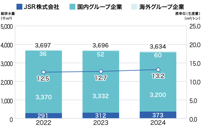 JSRグループの水資源使用量は、2024年度は3,862千m3(前年度比2%減)、総排水量は3,634千m3(前年度比2%減)でした。