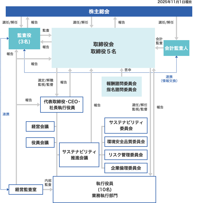 上記方針のもと、JSRは、監査役設置会社として、取締役会と監査役による業務執行の監視・監督を行う制度を基礎としつつ、報酬諮問委員会・指名諮問委員会の設置等の施策により、経営監督機能を強化し、経営の透明性・健全性を維持するとともに、中長期の企業価値向上に向けての意思決定や業務執行の迅速化、効率化に継続的に努めます。