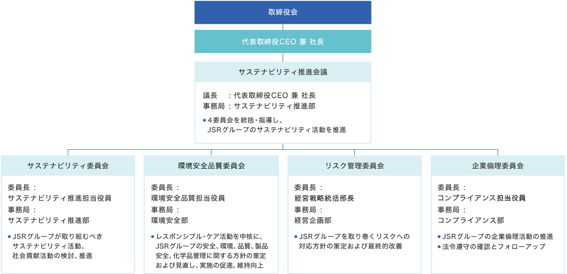 JSRグループは、環境の変化に対応しながらサステナビリティに関する取り組みを深化し、すべてのステークホルダーに価値を提供し続ける必要があるという考えから、サステナビリティ推進担当執行役員を委員長とするサステナビリティ委員会を設置しています。
