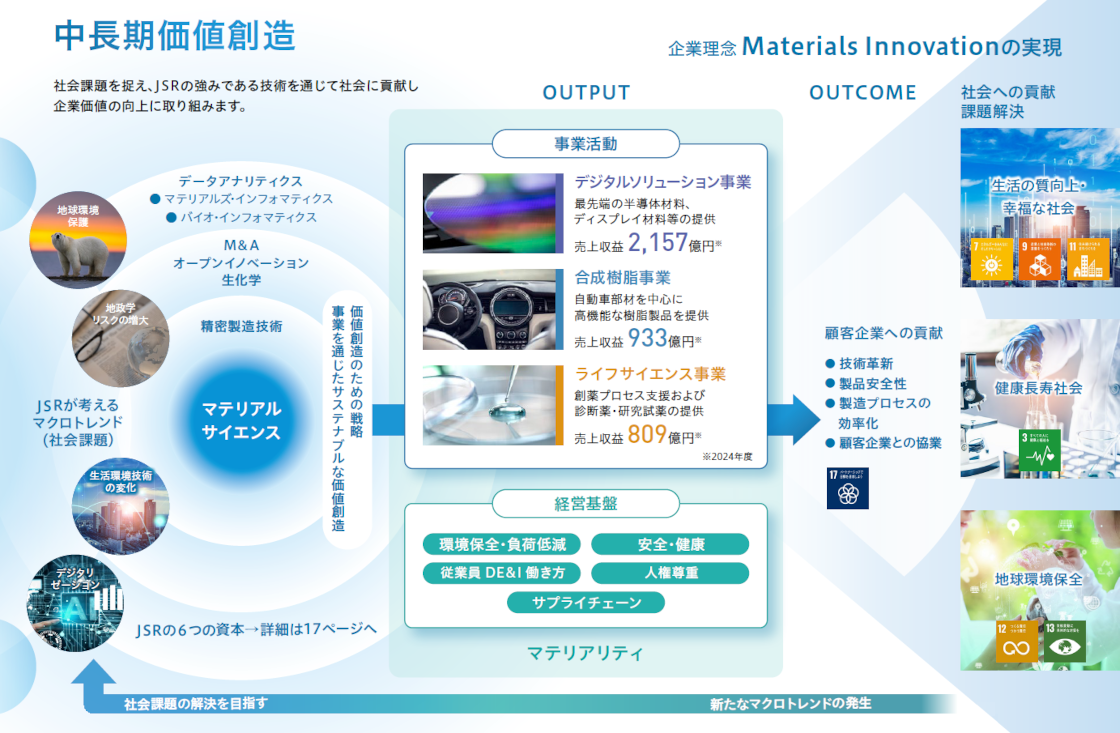 JSRは社会課題を捉え、JSRの強みである技術を通じて社会に貢献し企業価値の向上に取り組みます。